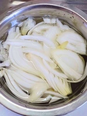 新玉ねぎを5㎝幅ぐらいにスライスし、水によくさらして辛味を抜きます。